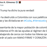 Congresista de los Estados Unidos Carlos Giménezen su red social señaló: “Gustavo Petro ha destruido a Colombia con sus patéticos pactos con narcoterroristas y dictaduras en #Cuba, #Venezuela y #Nicaragua”.